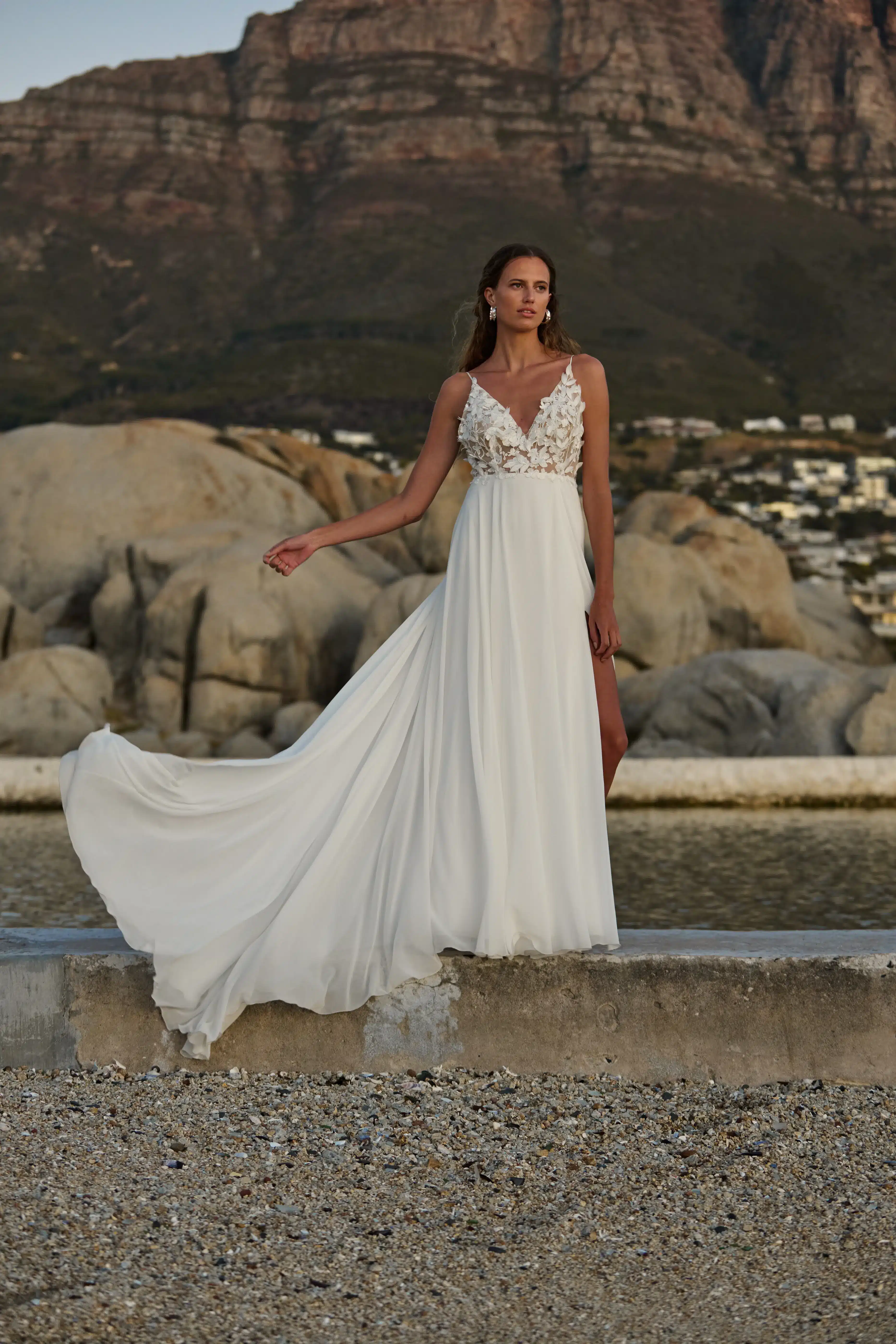 This wedding dress has a V neckline and V open back. The top is made of beige tulle with ivory flower applications and has thin straps. The skirt is high waisted, made of comfortable chiffon. It has an A-line silhouette and a sensual side slit with a stunning chapel train. Â