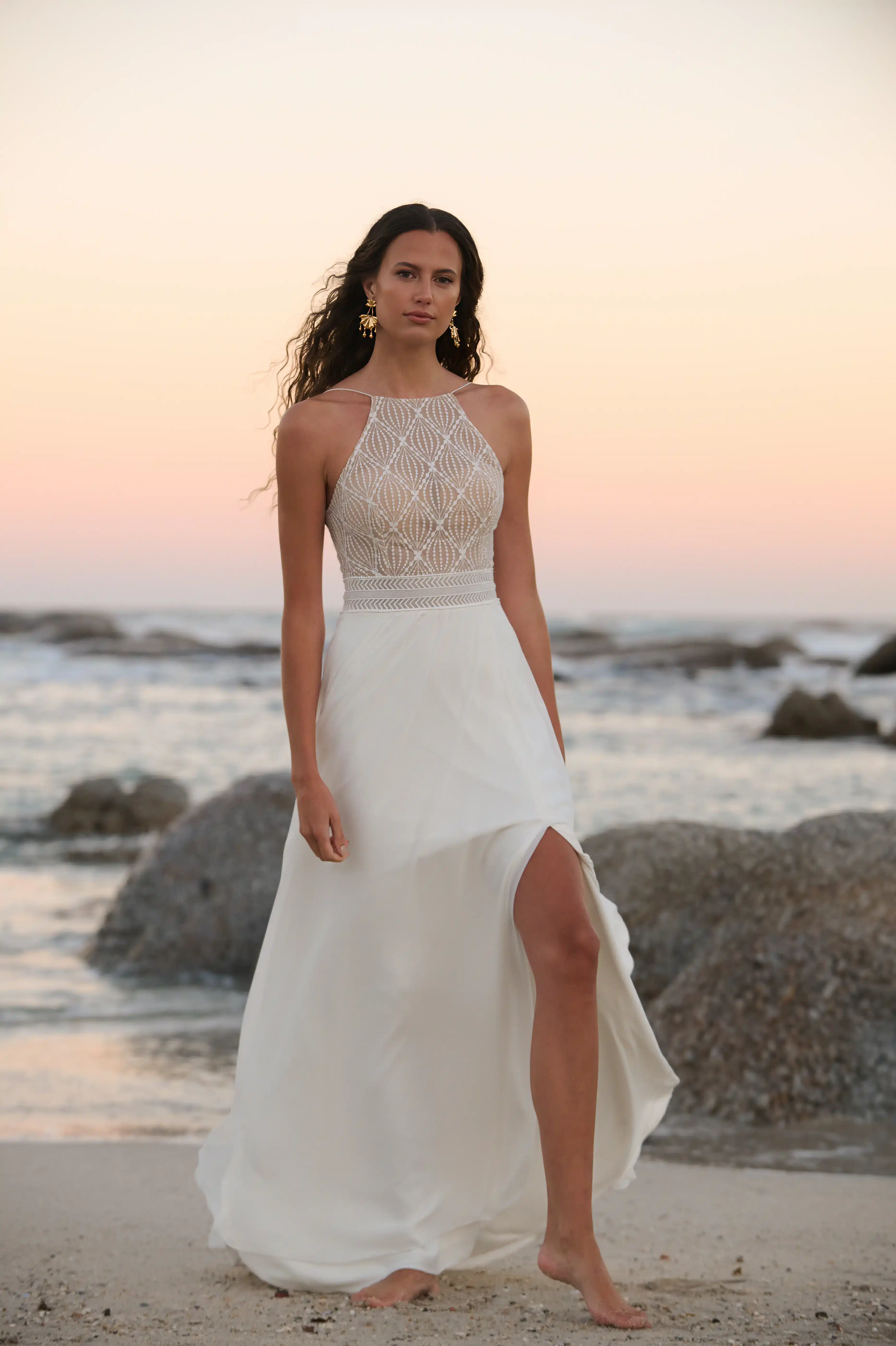 A light and feminine wedding dress! Cala Luna has a halter neckline with thin spaghetti straps and an open back. The top is made of ivory geometric embroidery with beige tulle underneath. The waist has an embroidered band around it with a different pattern from the top. The skirt is made of crepe with a flowy chiffon overlayer. It has a slit on the side and a sweep train. Â
