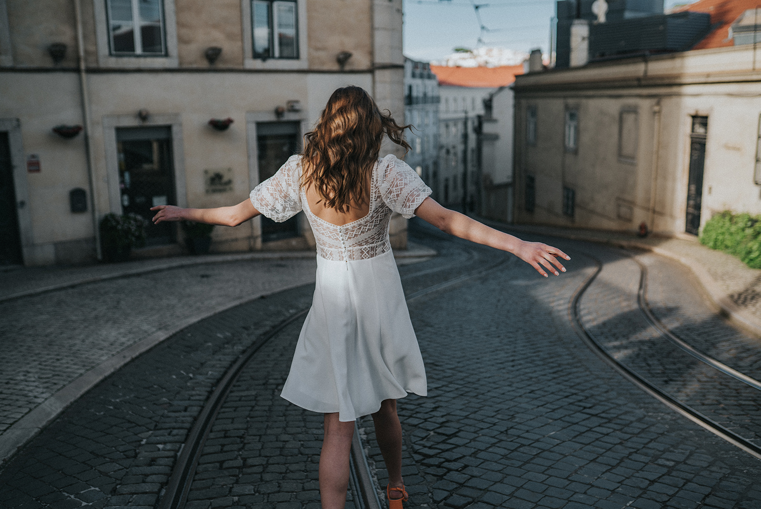 A short crepe dress with puffed lace short sleeves. The skirt of the dress is fitted and at the waist, there is a lace band.