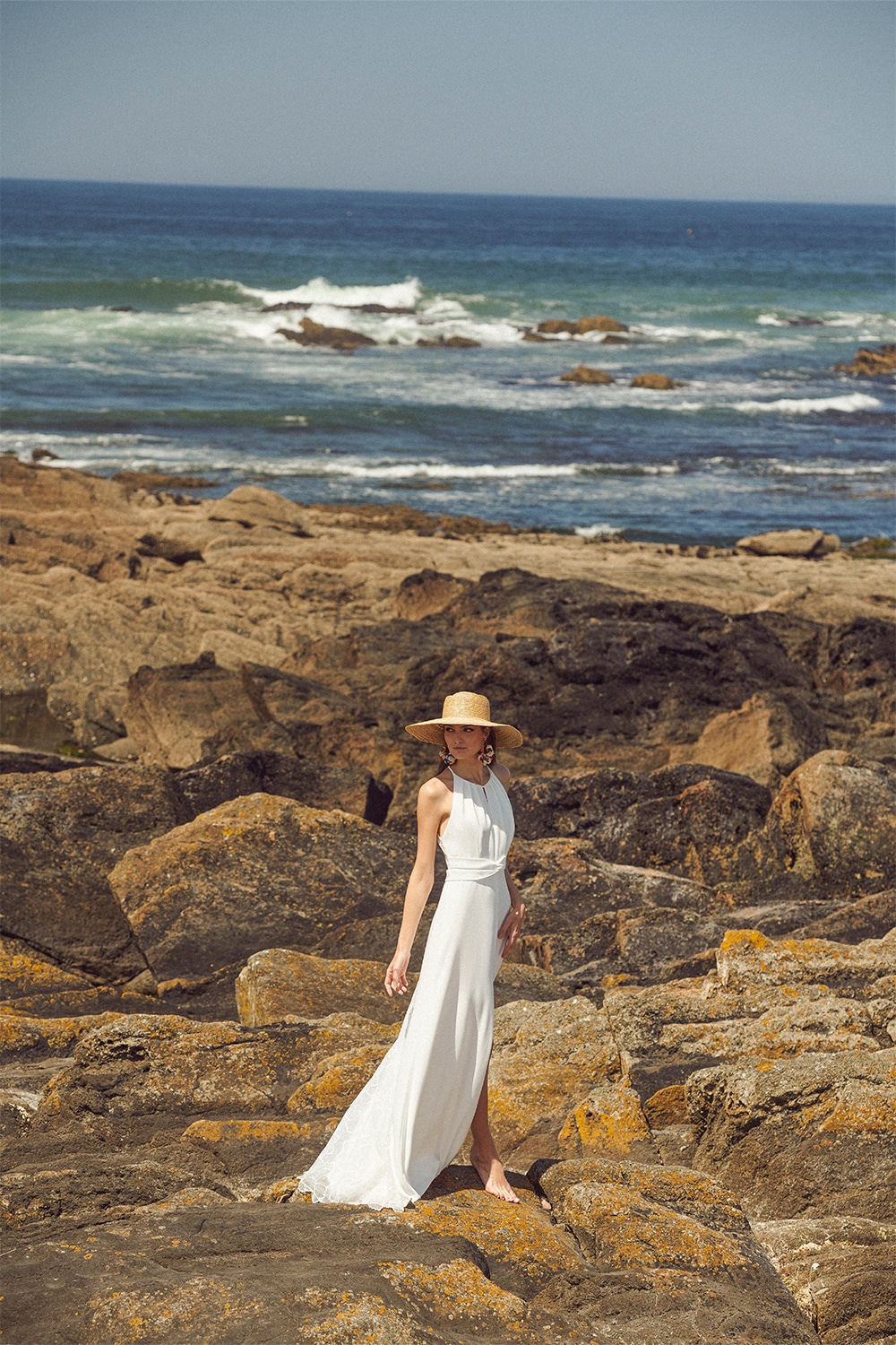 A dream dress in sustainable crepe with a halter neckline. The back is made of flower lace cut by hand, giving each dress a distinctive look. It has a triangle opening with a button at the top. There is a crossed band at the waist. The skirt has a lace train.Â