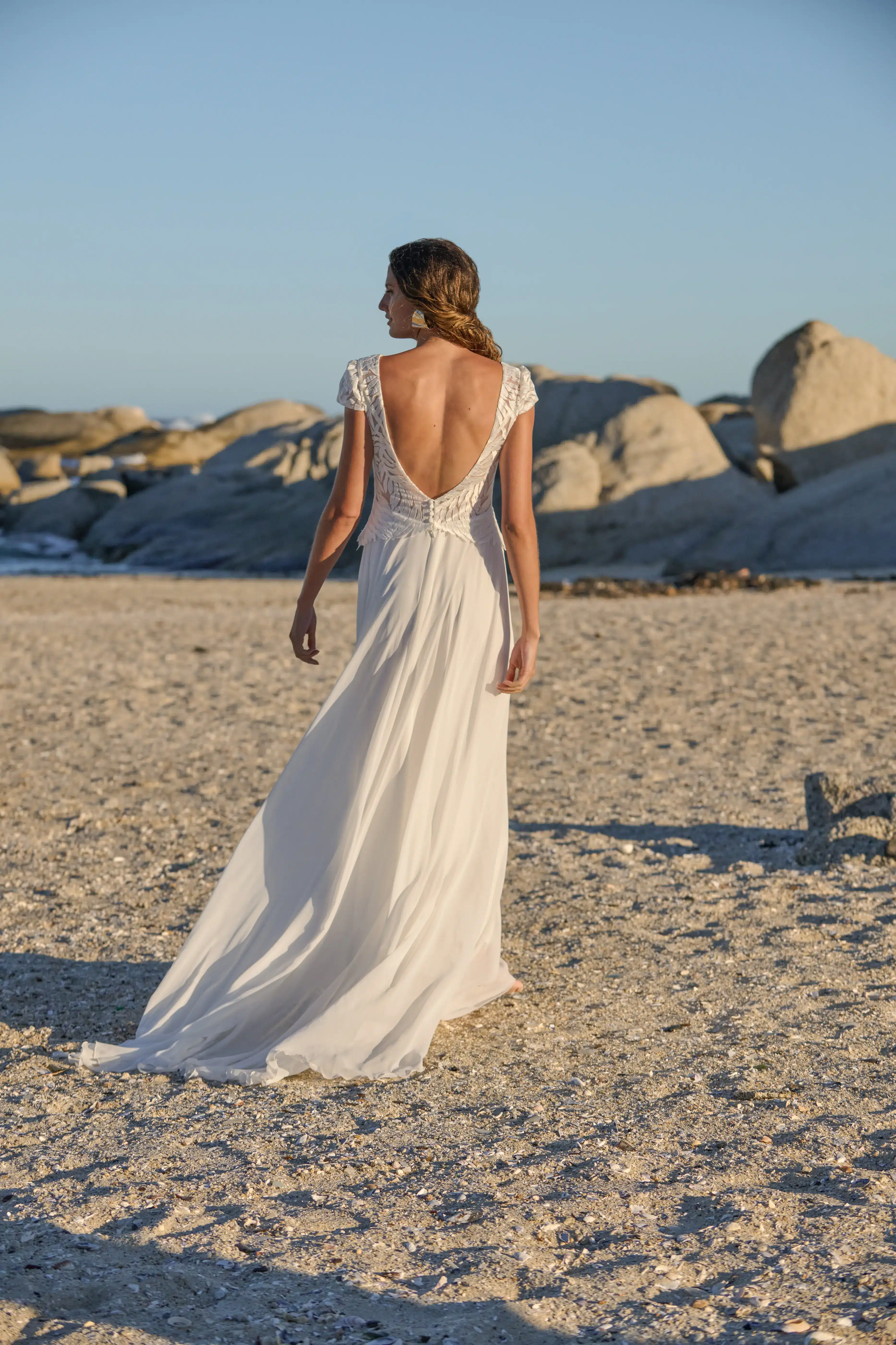 Natural elegance with the Paloma wedding dress! The top is made of embroidered leaves with beige tulle underneath. The embroidered leaves reach over the top of the skirt. Paloma has a V neckline and open back with short sleeves. It has a crepe skirt with a chiffon overlayer. The skirt has a slit on the side and a court train.Â