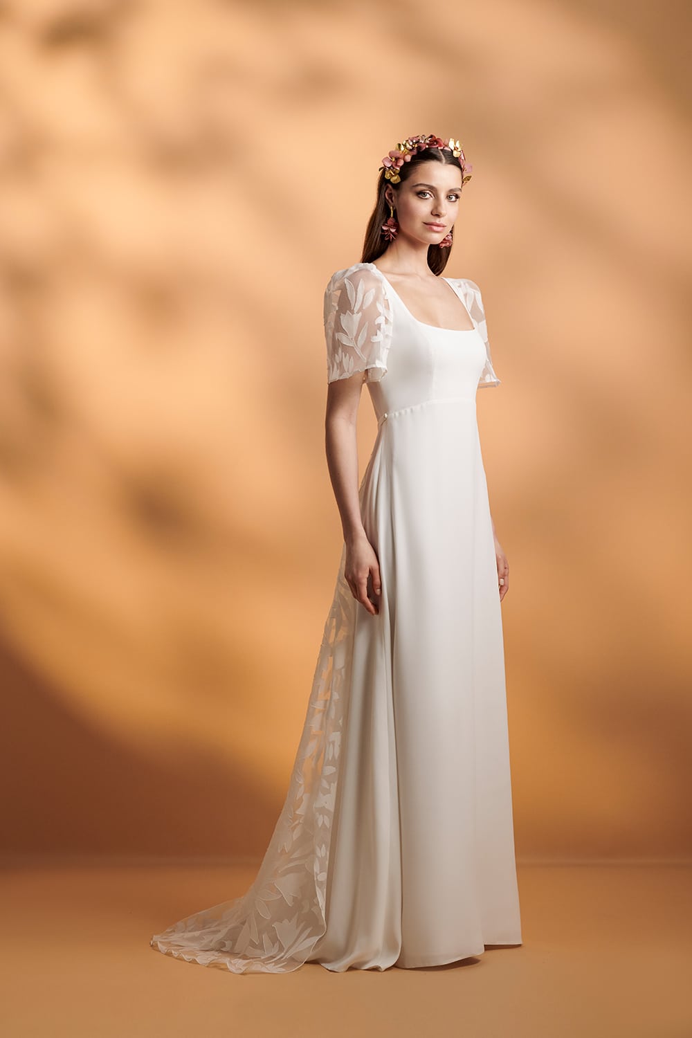 Une robe simple avec des détails romantiques. Le haut a une encolure carrée et un dos ouvert. Nora a des manches bouffantes en organza brodé. La jupe à une taille haute. La robe a une petite traîne détachable faite dans le même organza brodé que les manches.
